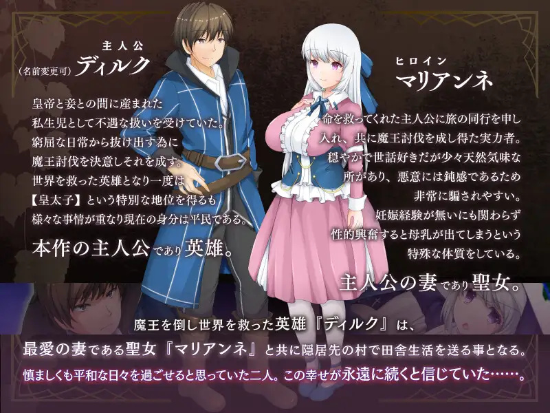 击败魔王拯救世界的英雄『迪尔克』,与挚爱的妻子、圣女『玛丽安涅』一同在隐居的村庄过着田园生活。
