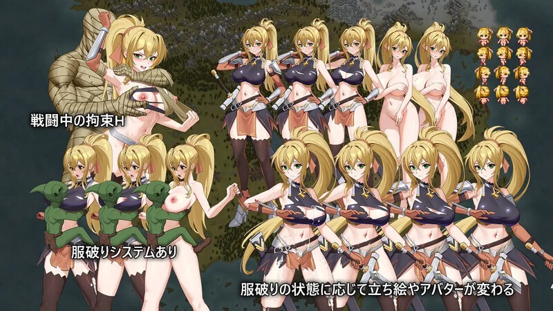 败北凌辱、卖春、衣物破损以及日常的色情展开等色情 RPG 的经典元素一应俱全。不仅女主角,城镇居民和其他冒险者的色情事件也都有所准备。部分敌人拥有束缚技能,若未能挣脱,将进入被侵犯的场景。同时,根据服装破损程度,战斗中的情色场景也会有所变化。