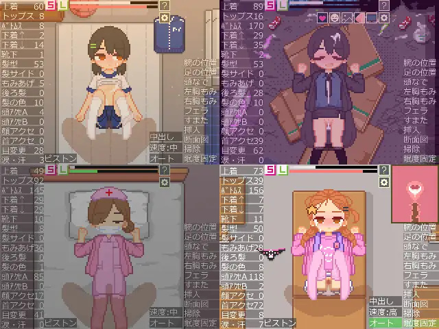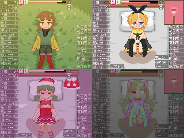 在这款游戏中,你可以对点阵图风格的女孩进行各种色情行为,或者为她们换装,享受乐趣。你可以想象各种情境,自由组合不同的服装和配饰。