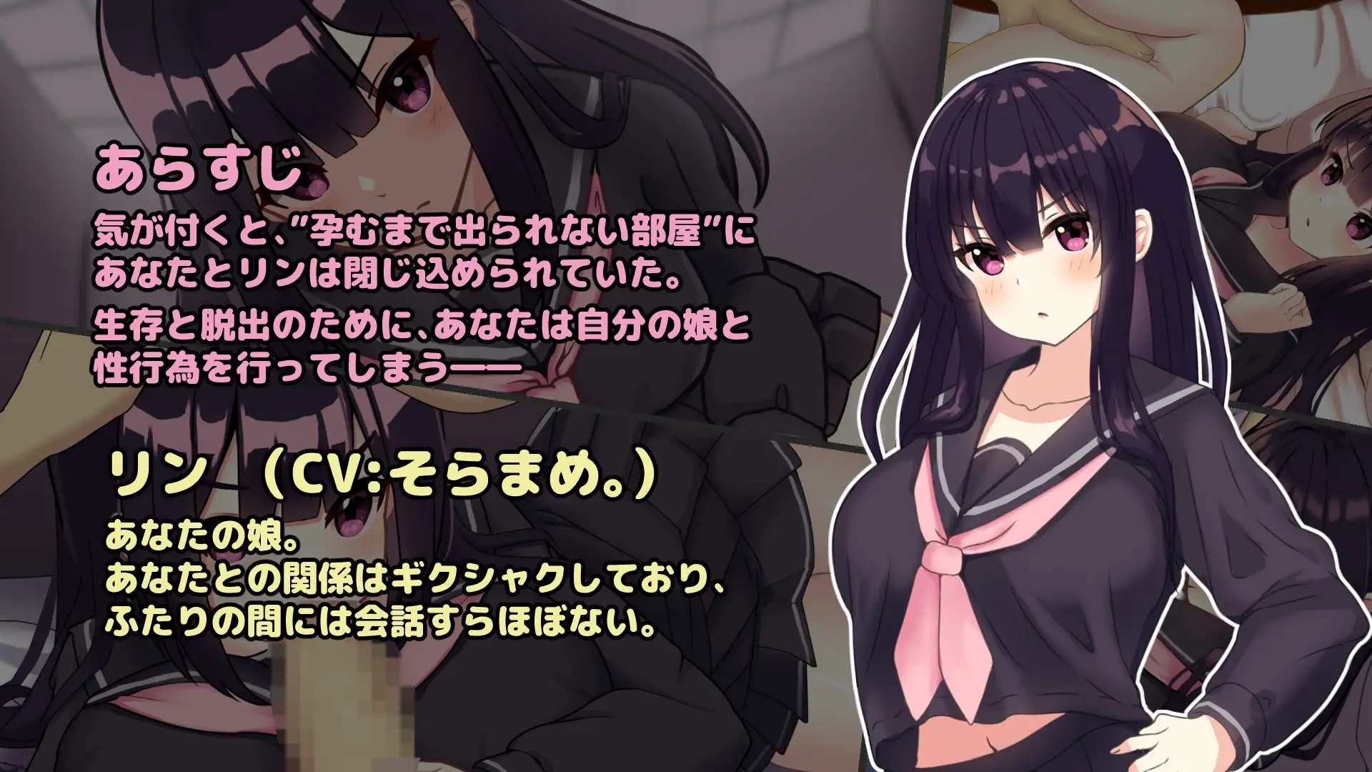 作为女主角的亲生女儿”琳”虽然对父亲态度冷淡,但为了脱出愿意配合进行亲密行为。色情场景CG数量:12张(v2.00版本)