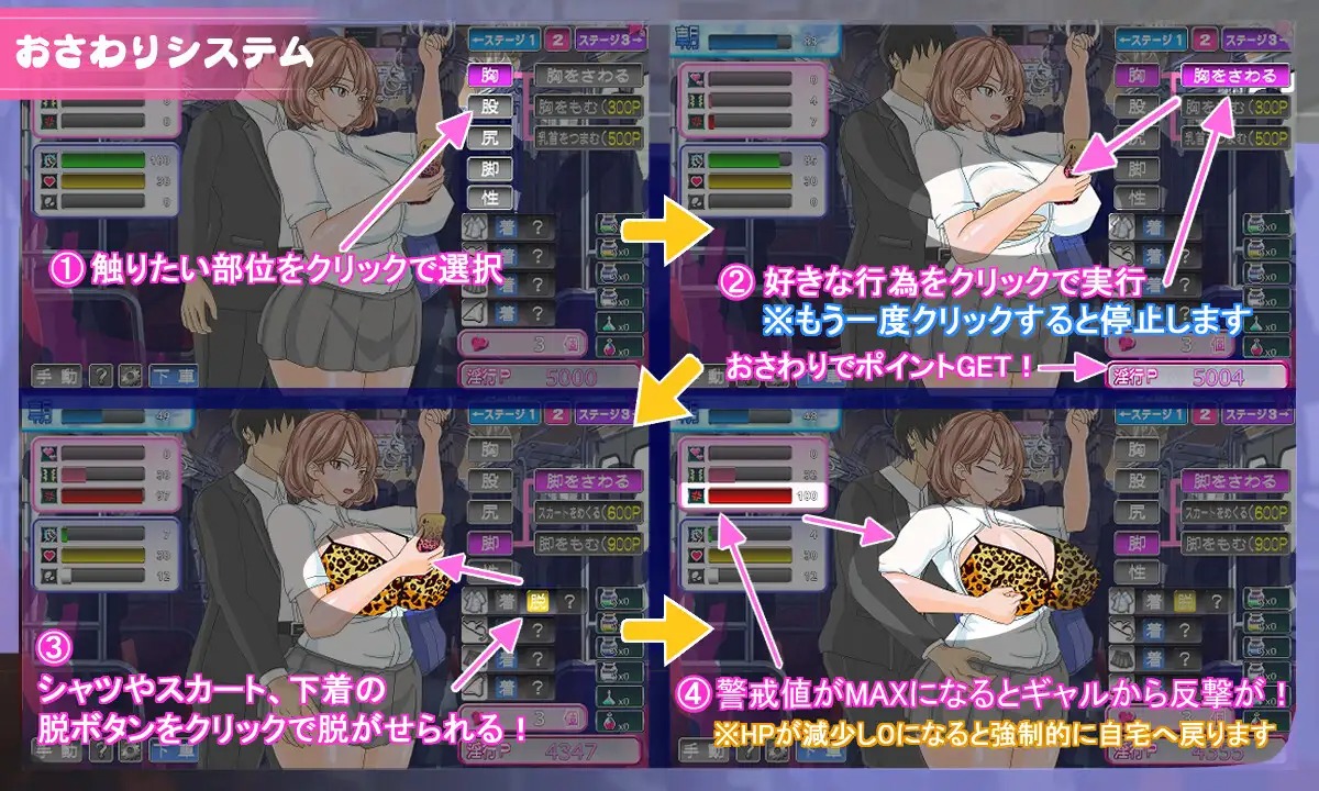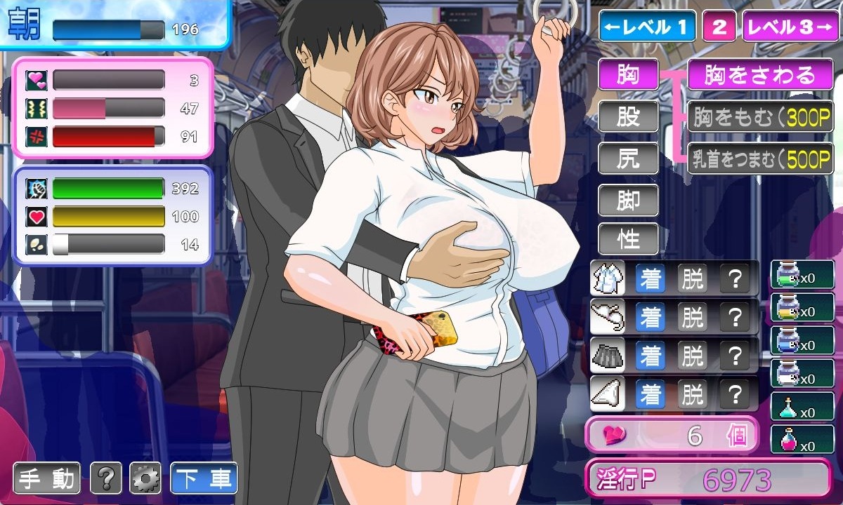 在电车内对辣妹进行性骚扰行为可以积累点数,从而解锁更升级的行为。当快感值达到最大时,辣妹会达到高潮,你便能获得她的心。