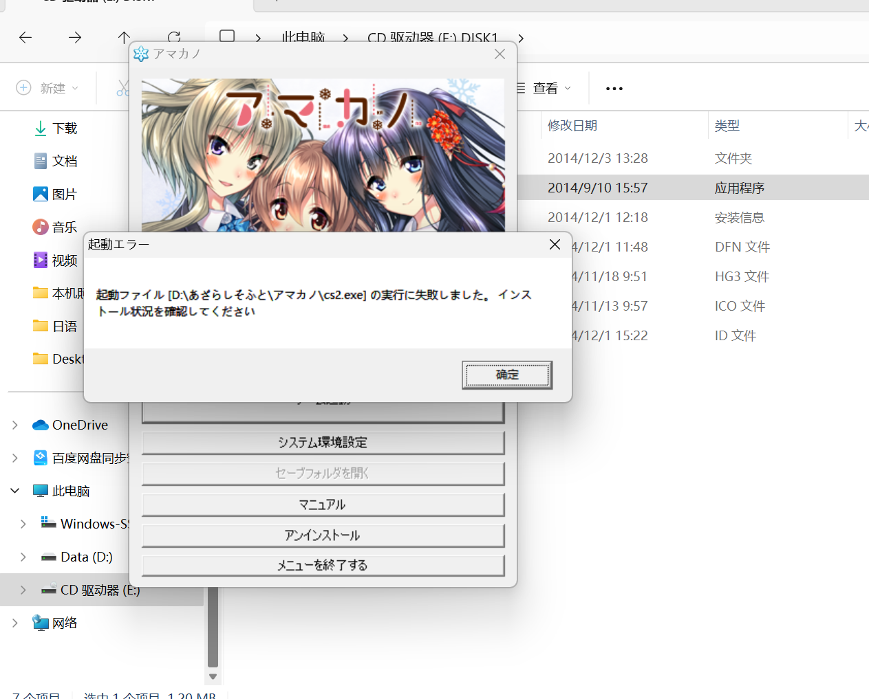 在本站下载的アマカノ解压完文件里有exe文件,但打开玩不了,然后我转区改到日本也打不开,然后搞虚拟光盘镜像,也没打开,我是个小白,自己摸索了半天不知道什么原因,请求各位大佬帮助,提前感谢各位大佬,或者有更好的甜蜜女友第一部链接也请麻烦大佬们提供一下,谢谢