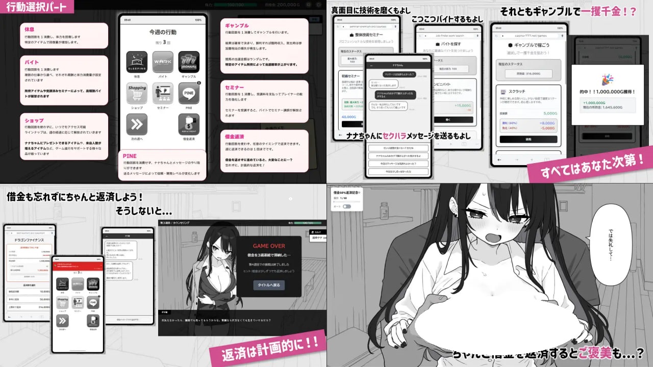 「休息」「兼职」「赌博」「商店」「研讨会」「PINE」「还债」等中选择,