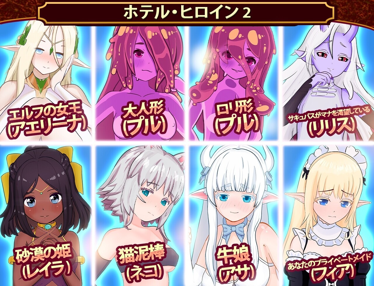 挤牛奶、教导年轻的公主、与女骑士战斗、捉弄睡觉的女孩、培养史莱姆,还有其他许多有趣的事情!总共有 25 个场景。