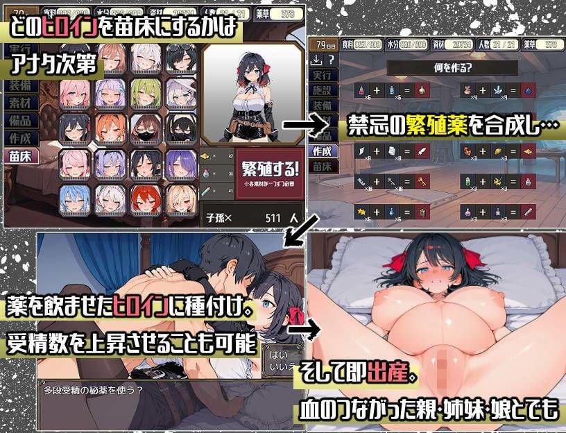 通过合成探索获得的素材,将女主角的身体改造为可即时受精和分娩的状态。<亲密场景与情境>