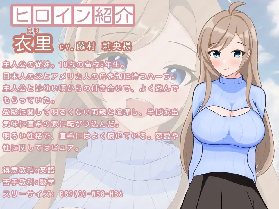 某个夏夜,高中三年级的表妹衣里(绘里饰)突然闯入独居的社会人主人公直希(玩家饰)的身边。“我想和直君上同一所大学。”