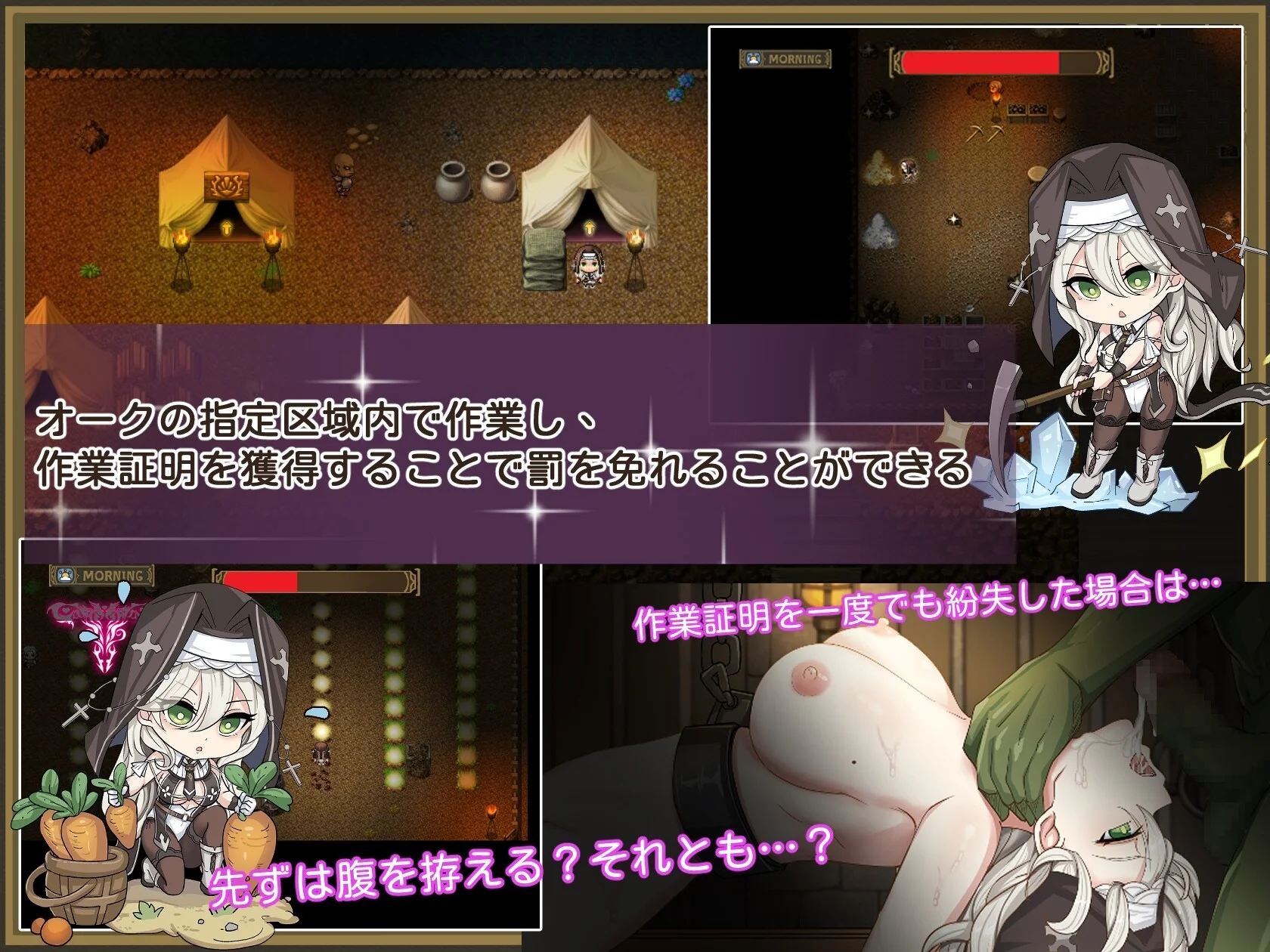 在讨伐魔物的旅途中,圣女不幸沦为阶下囚。被带走后,映入她眼帘的是拥有高度智能、并筑起巨大地下要塞的兽人们。本作是一款以逃离已成为兽人巢穴的地下牢狱为目标的探索型RPG。