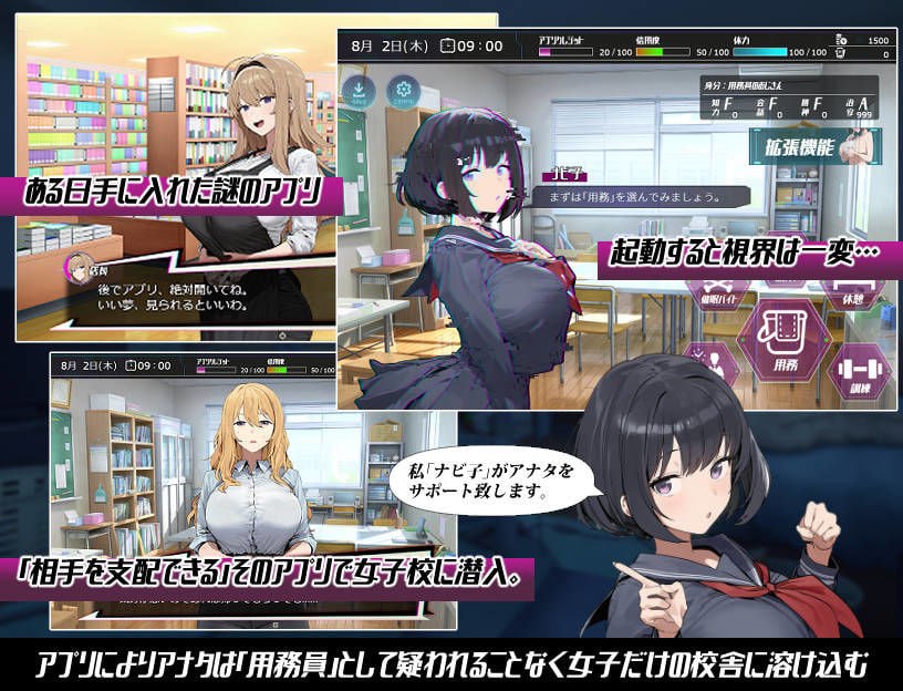 那一瞬间,一名似曾相识的美少女出现在眼前……但与记忆中的她不同,这名少女缺乏情感表达,并自称为“向导”。随后她告诉主人公,这款APP可以随心所欲地操纵心仪的对象。主人公在半信半疑间听着讲解,意识却突然陷入混浊。等睁开眼时,主人公已经成为了“女子学校的校工”,并能在不被任何人怀疑的情况下自由行动……